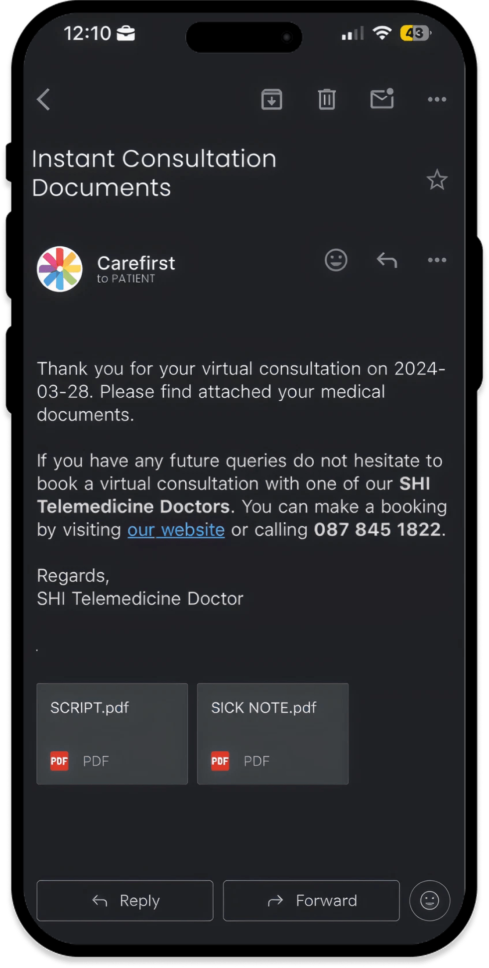 Scripts, sick notes, and referrals sent instantly to your phone—no waiting, just instant care.